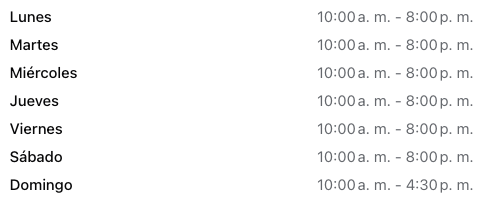 De Lunes a Sábado de 10 am a 8 pm/ Domingo de 11:00 a 4:00